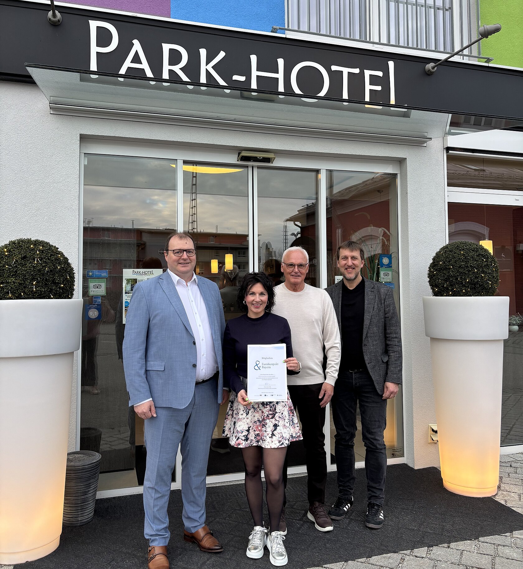 Mit im Gepäck hatte Landrat Michael Fahmüller auch die Urkunde für die Mitgliedschaft des Parkhotels am „Familienpakt Bayern“. „Das Parkhotel Pfarrkirchen ist nun dem Familienpakt Bayern beigetreten und bringt damit zum Ausdruck, dass sie sich in ihrem Arbeitsalltag für eine familienbewusste Personalpolitik einsetzen“, erläutert der Landrat. „Dass unsere Angestellten zum Teil schon viele Jahre lang bei uns arbeiten, zeigt, dass wir bei der Vereinbarkeit von Familie und Beruf vermutlich vieles ohnehin schon richtig machen“, erklärt Romy Dadlhuber. „Gerade Frauen, die bei uns arbeiten, schätzen es, dass man in Notfällen das Kind auch mal mitnehmen darf oder man im Falle fehlender Kinderbetreuung Schichten flexibel tauschen könnte.“ Besonders wichtig sei auch eine langfristige Planung der Dienstpläne. „Auch das sorgt dafür, dass wir gerade bei Angestellten mit Kindern Termine und private Ereignisse berücksichtigen können“, so Dadlhuber, die überzeugt ist, dass es immer auch ein Miteinander ist. „Das ist ein Geben und Nehmen. Und da ich selbst Familienmensch durch und durch bin, ist es mir ein Anliegen, dass sich Familie und Beruf bestmöglich vereinbaren lassen. Umso mehr freut es uns, dass wir nun Mitglied im Familienpakt Bayern sind.“ „Auch unser Landkreis profitiert davon, wenn sich Betriebe diesem Netzwerk anschließen – für starke Familien, motivierte Mitarbeitende und eine zukunftsfähige Wirtschaftsregion. Daher meinen Glückwunsch und weiterhin alles Gute“, so der Landrat.