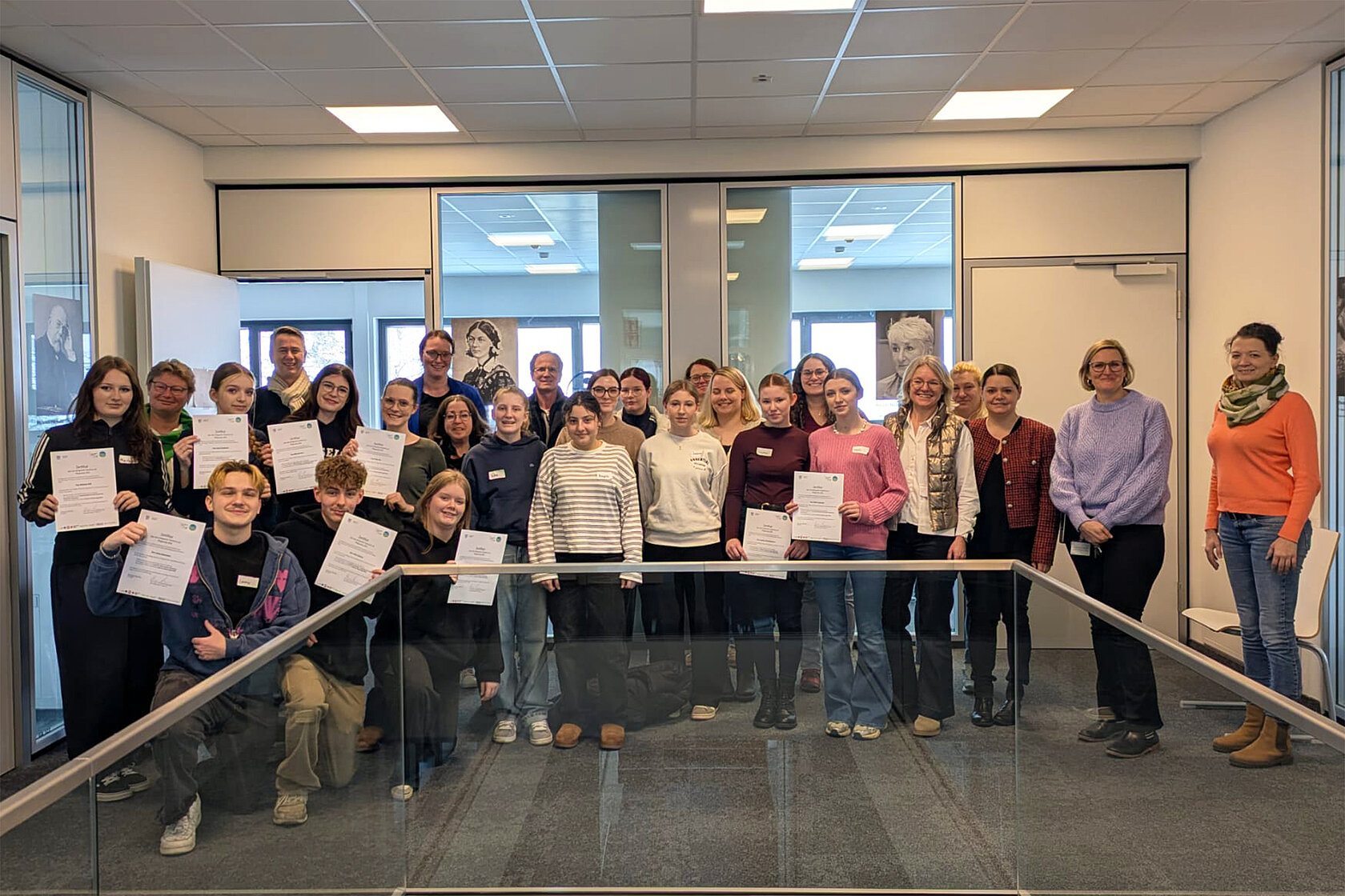 Gruppenfoto: Drei Tage voller Engagement für die Pflege: die 15 Jungen und Mädchen zeigen stolz ihr Zertifikat für die erfolgreiche Teilnahme am Pflegecamp Rottal-Inn. Mit ihnen freuen sich (von links nach rechts): Maria Linner, Pflegedirektorin an den Rottal-Inn Kliniken; Christian Reif, Heim- und Pflegedienstleitung beim Wohn- und Pflegeheim Christanger Eggenfelden; Anna Huber, Geschäftsstellenleitung Gesundheitsregion plus Rottal-Inn; Kathrin Seiler, Geschäftsführender Vorstand Kreis-Caritasverband Rottal-Inn e.V.; Markus Ellinger, stv. Pflegedirektor Rottal-Inn Kliniken; Daniela Schiefenbusch, Ausbildungsbeauftragte für Pflegeberufe beim BRK Rottal-Inn; Carina Mierswa und Sara Mailhammer, beide Lehrkräfte an der Berufsfachschule für Pflege an den Rottal-Inn Kliniken; Bettina Plettl, Geschäftsführerin der MediVital Sozialstation; Marina Stadler, Koordinatorin für Praxisanleitung beim Parkwohnstift; Katrin Klinglbrunner, Schulleitung des KWA Bildungszentrum Pfarrkirchen; Elisabeth Schoske, Schulleitung der Berufsfachschule für Pflege an den Rottal-Inn Kliniken; Silvia Saller, zentrale Praxisanleiterin an den Rottal-Inn Kliniken.